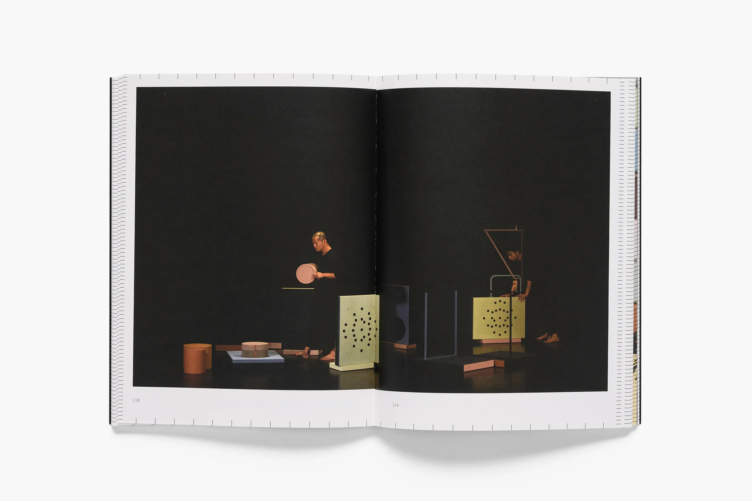 《Black Mat Oriole》展出了Suki許多代表性作品,包含Jeong、Mat、Legs、Heavy Round、Warm Round系列,以及Moras on the Black Mat。Suki將「繪畫」拓展為不同的形式,這些雕塑、裝置、繪畫都按照對應的比例製作,以利相互堆疊形成可移動的塔、窗和平台。書中有許多Suki針對表演動作繪製的手稿,可以看到人在網格中每一步的動作與姿態,並涵蓋了143張作品照片,以及《Black Mat Oriole》展覽的活動紀錄,也收錄了策展人、學者與藝術家的對談。