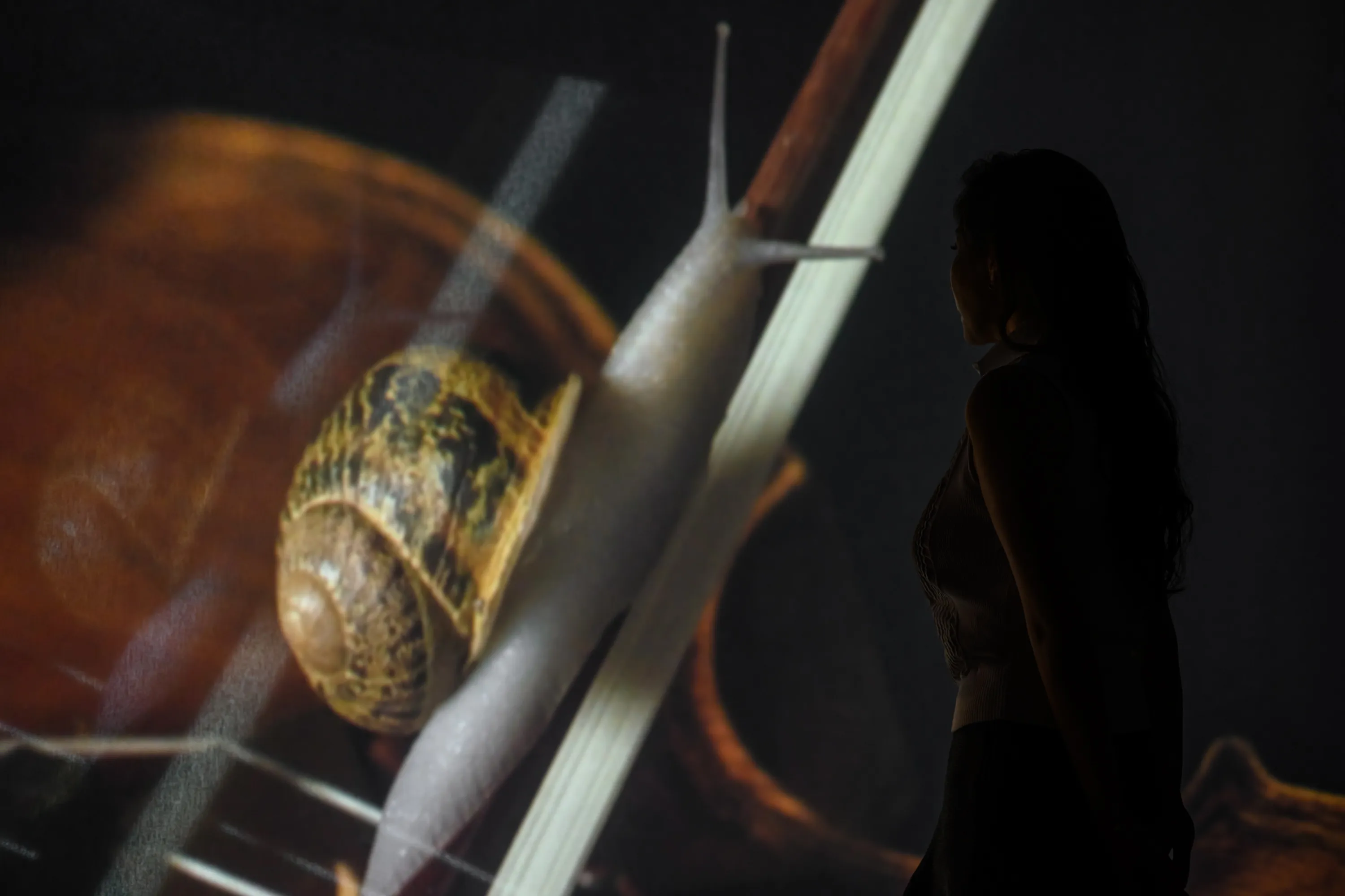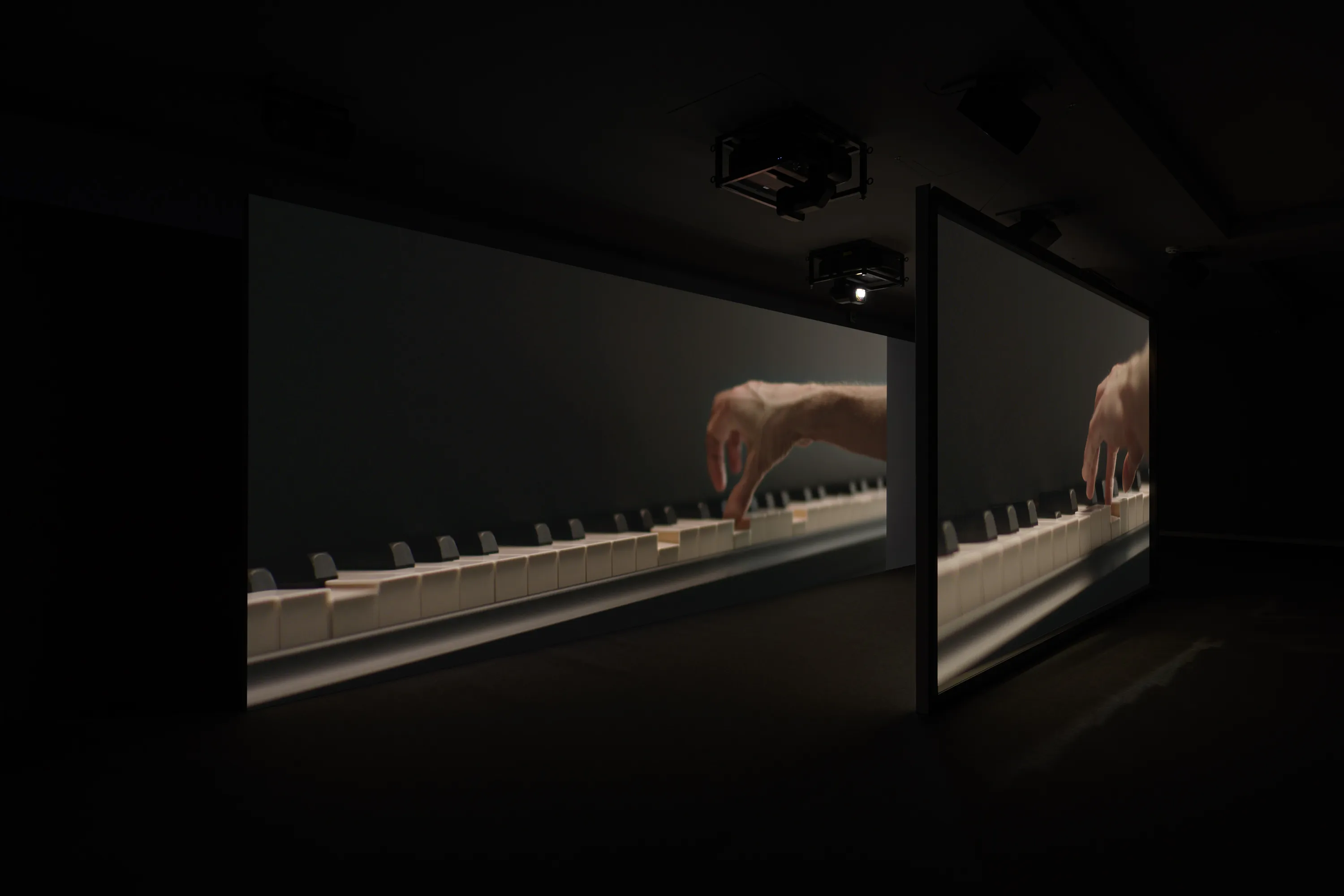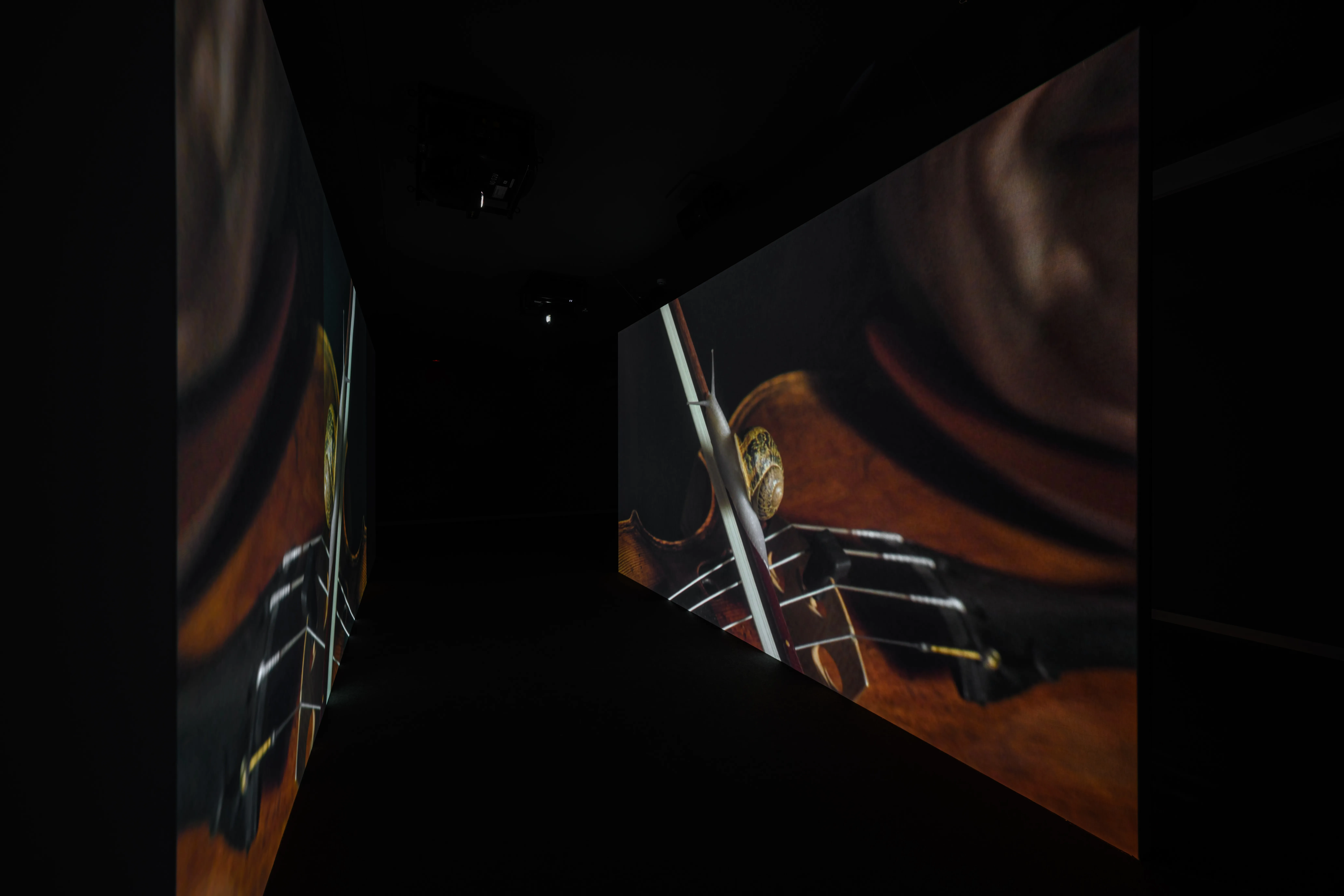 The piece on display, AS YOU GO, consists of three videos, “Ravel, Ravel,” “Take Over” and “If and only if.” “Ravel, Ravel” is composed through a re-arranged performance by Sala, a new interpretation of Maurice Ravel's Left Hand Concerto for Piano and Orchestra, which resonates in the space between the two performances due to the time gap between them; “Take Over,” revolving around the politically and historically entangled Marseillaise and The Internationale, played by a pianist and a player piano, deals with their musical lineage and the ever evolving political symbolism; “If and only if” is a reinterpretation of the composer Igor Stravinsky's Elegy, in which a crawling snail and a fiddler interact in a delicately balanced relationship that makes the musical arrangement tangible. "AS YOU GO" is not only an interweaving of three video pieces, it is a projection installation as well as a unique and gigantic kinetic sculpture.