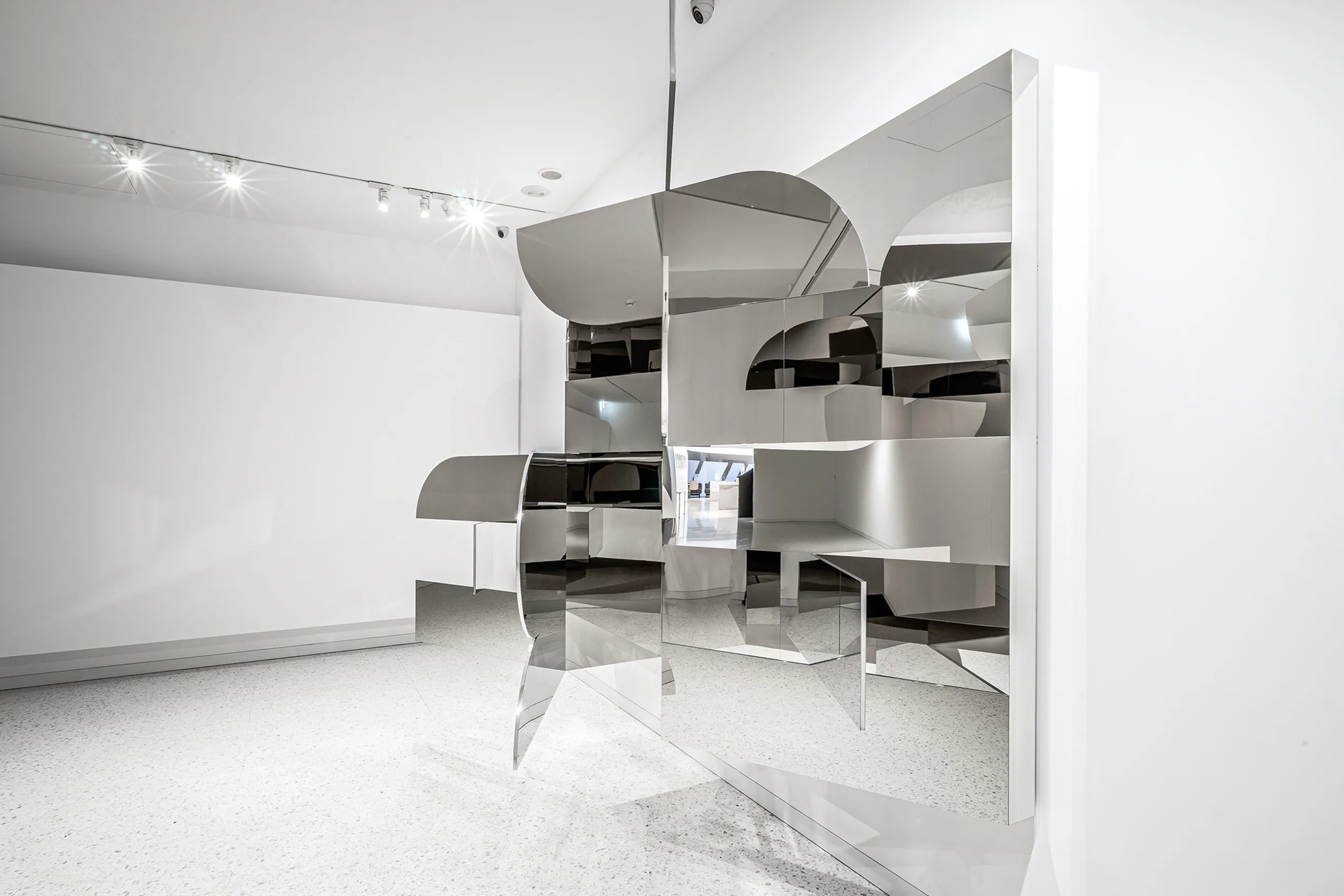Desire, a work of art by Doug Aitken, features how mirrors segment image of people and their surroundings. Each individual image carries new perspectives, and each individual segment reflects the relations between people and space, intertwining narratives of dialogues between the viewer and the space around them. This giant mirror sculpture acts like a medium. Through its projection, the viewer not only sees the external form of an object, but also the desire deep inside themselves. Aitken stereoscopically translates narratives into a structural form. Viewing his work from different angles is like a three-dimensional reading of space and oneself. The viewer is allowed to thoroughly experience the influence brought by this space. When one enters this art hall of pure white color, due to the special design of the space, it simultaneously induced some change on one's movements. The interaction between people and their surroundings or between one and others is affected by the atmosphere, forming an entirely new social system.