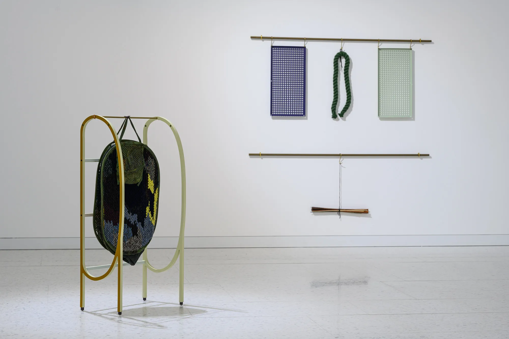 Kang said, "I put myself as a mediator to combine different materials together to harmonize, to become individual." The recent "Note" series brings together materials with different characteristics in a "grid" space as a fragment of the idea for narration. Presented in the form of hanging, the works are transformed from paintings on flat canvases into a multi-layered combination of three-dimensional objects such as mesh, thick rope and dyed rush, just like the extension of "painting". These components are like paints which reveals the stories that Kang wants to convey. Kang intervenes in the space with "painting" in many ways to achieve a state of balance and harmony.