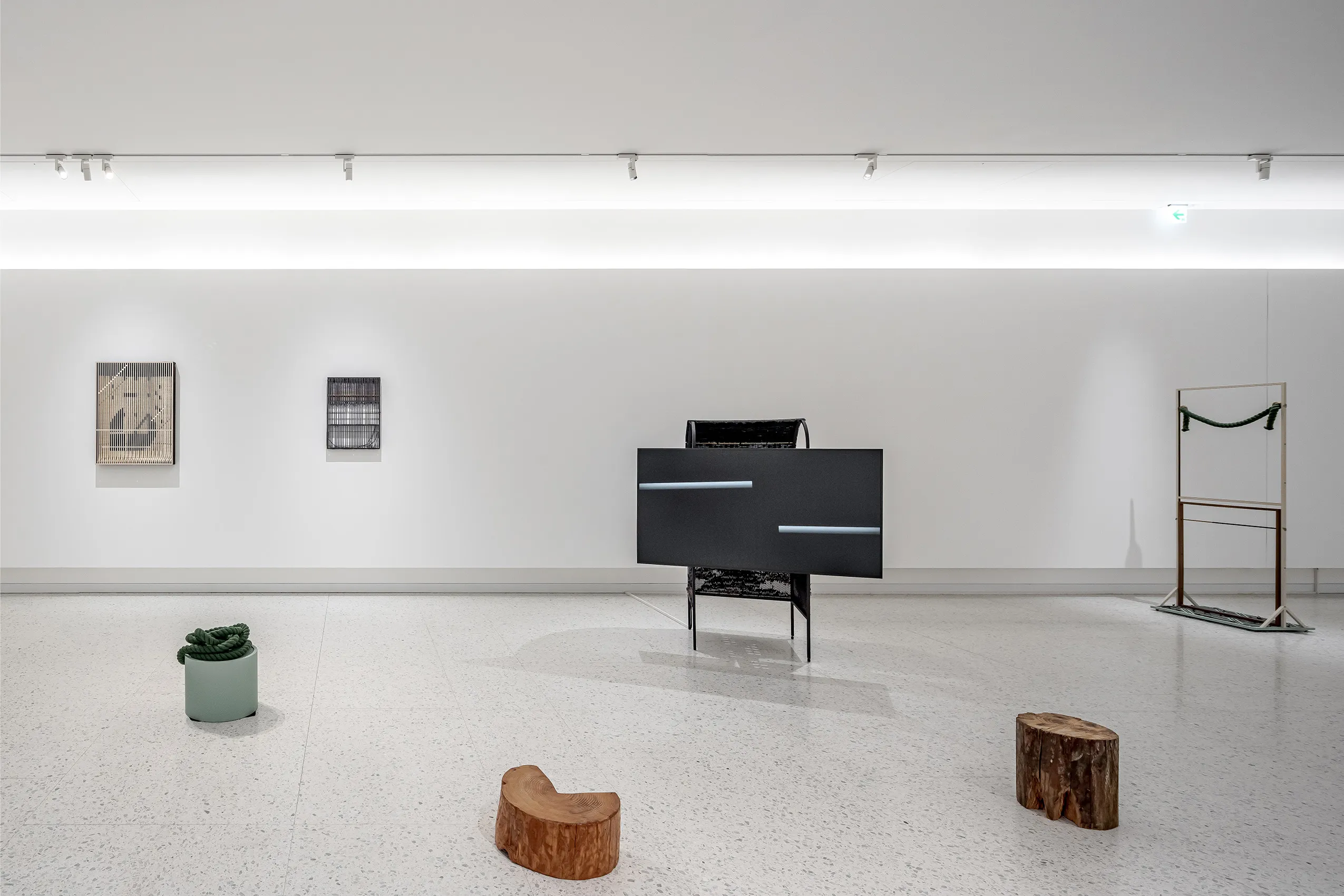 In addition to historical elements, physical and mental memories are also often woven into the structure and appearance of Kang's works. "Rove and Round" means "walking in circles," which describes a person who keeps moving in a limited area without crossing the boundary. The series is composed of three elements: face, belly, and mat. The curved shape of the work is created by the artist based on the measurement of her own body. The pillar structure is a part supporting the body, just like the grip of a walking aid, while the mat evokes the awareness of body territory.